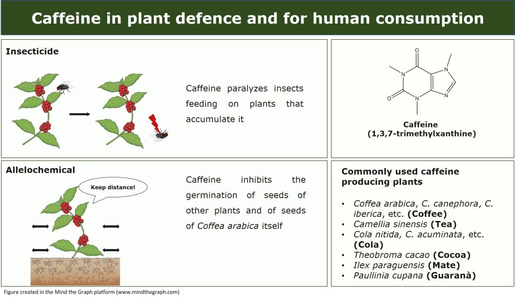We often see plants as passive. After all, what can they do if they are attacked by an animal that aims to eat them? They cannot run away. They are stuck there. No hope (apparently). Yet, they did not succumb during evolution. How is that possible? Well, plants are not that helpless as they might seem. They have different defence lines. Some defences are anatomical traits, others are chemical compounds that may kill the herbivore (or act in many other ways). Sometimes plants produce and store defensive chemicals, while in other cases these are produced and accumulated only when the plant is attacked. Caffeine is the kind of compound that is produced and accumulated, but its amount in the plant also increases when needed upon attack.