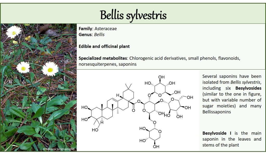 The saponins isolated so far from Bellis sylvestris are characterized by the lipid backbone of bayogenin (a derivative of oleanolic acid) that can then be even further modified (2,3,4). Among these saponins, many were also reported from Bellis perennis.