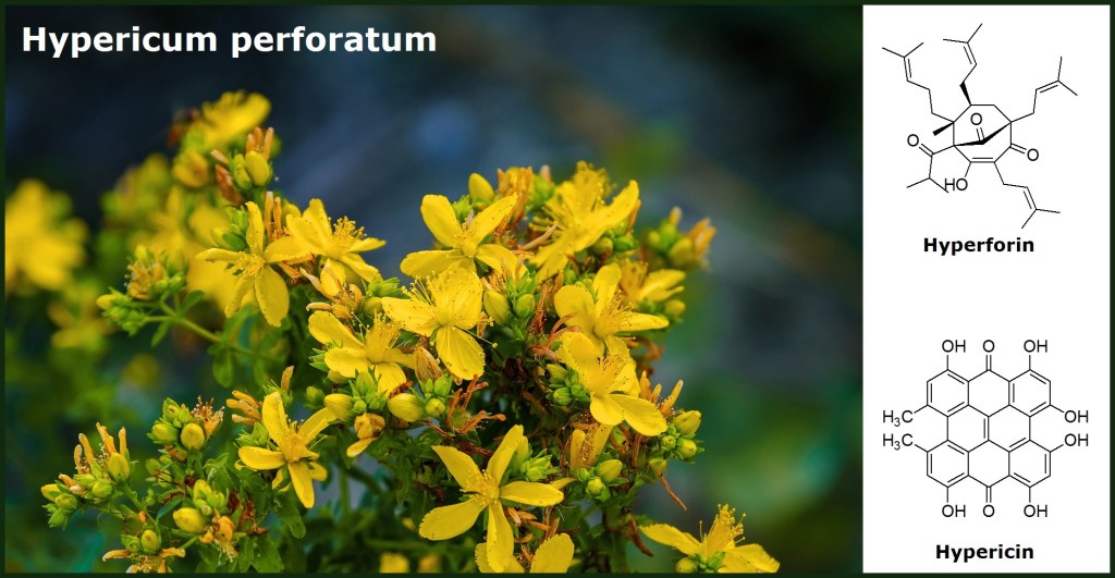 Several classes of bioactive specialized metabolites have been identified from extracts of Hypericum perforatum, including flavonoid derivatives, naphthodianthrones, phloroglucinol derivatives and xanthones (3). Among these, hypericin and hyperforin are the most interesting ones. The latter, a prenylated phloroglucinol, is the main responsible for the antidepressant activity. Hyperforin inhibits the uptake of several neurotransmitters from the synapse into the pre-synaptic neuron (7), therefore increasing the extracellular concentrations of the neurotransmitters. The activity is exerted by elevating the intracellular sodium concentration in the presynaptic neuron, thereby inhibiting the gradient-driven neurotransmitter reuptake (7). Also hypericin, a naphthodianthrone, seems to have a role in the antidepressant effect of Hypericum perforatum. These two compounds have actually also other properties, and we will surely have the chance to further discover and analyse them in the future, having also a deeper look at their mechanisms of action.