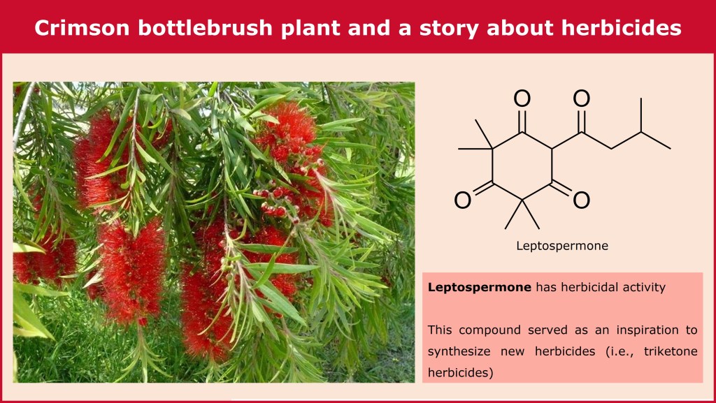 In case of the bottlebrush plant, the specialized metabolite which is responsible for the effect in nature has served as a sort of guide to develop new herbicides. The possibility of using natural products or natural product-derived chemicals as herbicides is linked not so much to their hypothetical low toxicity (remember that natural does not mean safe), but to the fact that evolution has been shaping these compounds for so long, that it is worth trying to get inspiration from them. Probably, the most convincing argument in support of the search for natural herbicides is linked to the possibility of finding alternative modes of action as compared to the ones of the currently available chemicals, a compelling need to counteract the ever-increasing herbicidal resistance problem.